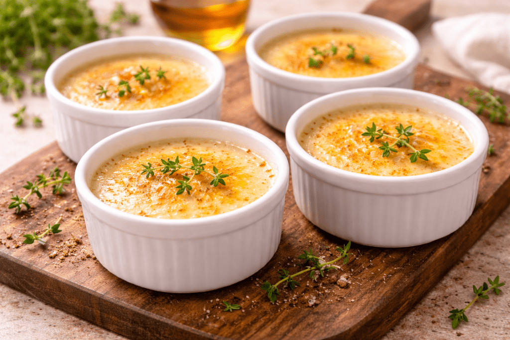 Burnt Honey and Thyme Custard Pots (Greek Island Style) are smooth baked custards flavored with caramelized honey and fresh thyme. They are simple but elegant, reflecting Mediterranean flavors.
