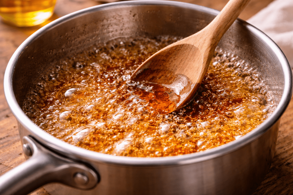 The honey is gently cooked until slightly darkened. This step deepens the sweetness and adds a light caramel flavor.