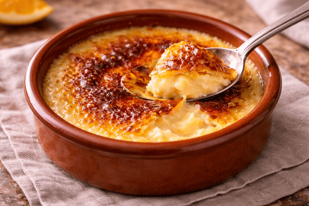 Crema Catalana (Spanish Crème Brûlée) is a historic dessert from Catalonia known for its smooth custard and crisp caramel top. It is lighter than French crème brûlée and flavored with lemon peel and cinnamon.