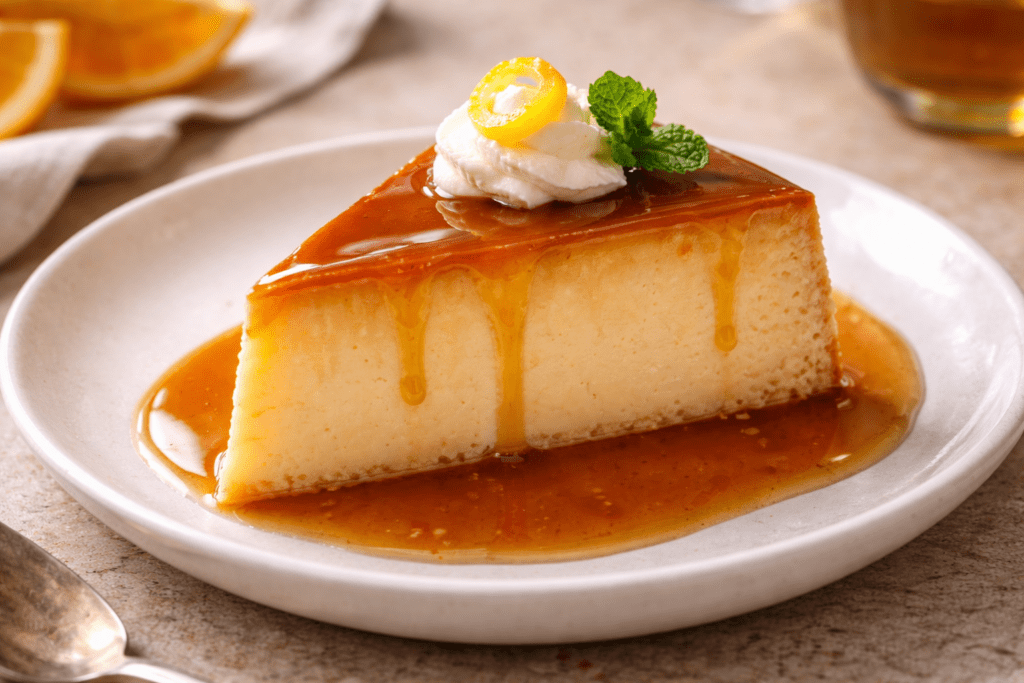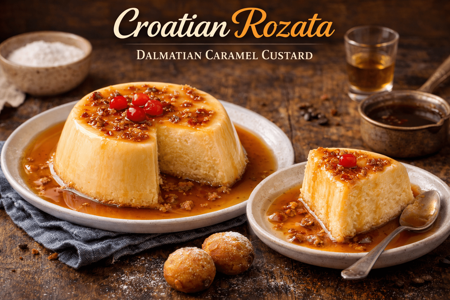 Croatian Rozata (Dalmatian Caramel Custard) is a traditional dessert from Dubrovnik known for its smooth custard and golden caramel topping. The optional rose liqueur adds subtle floral aroma.