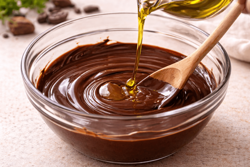 High-quality olive oil has mild fruity notes. When mixed with dark chocolate, it: