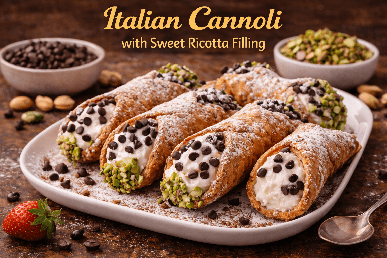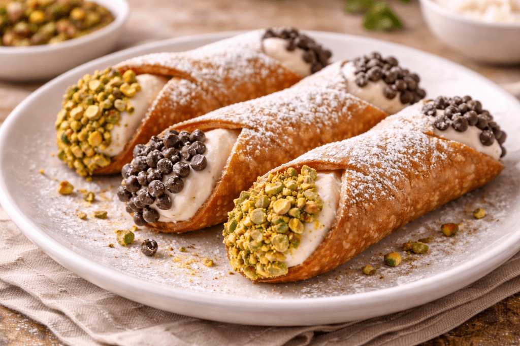 Italian Cannoli with Sweet Ricotta Filling is one of the most famous desserts in Italian pastry tradition. These crisp, tube-shaped shells are filled with smooth, sweetened ricotta cream and often finished with chocolate chips, chopped pistachios, or candied fruit.